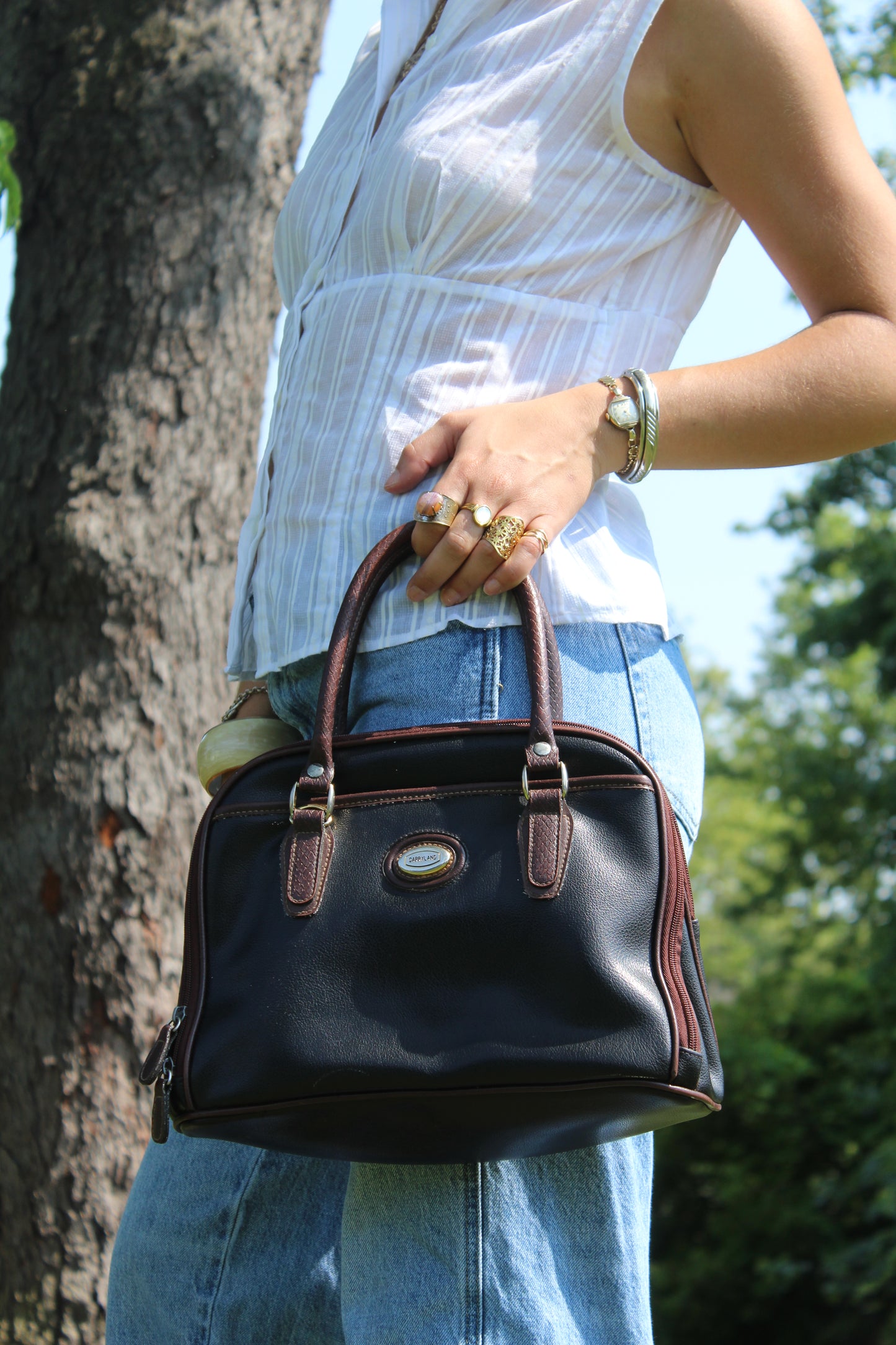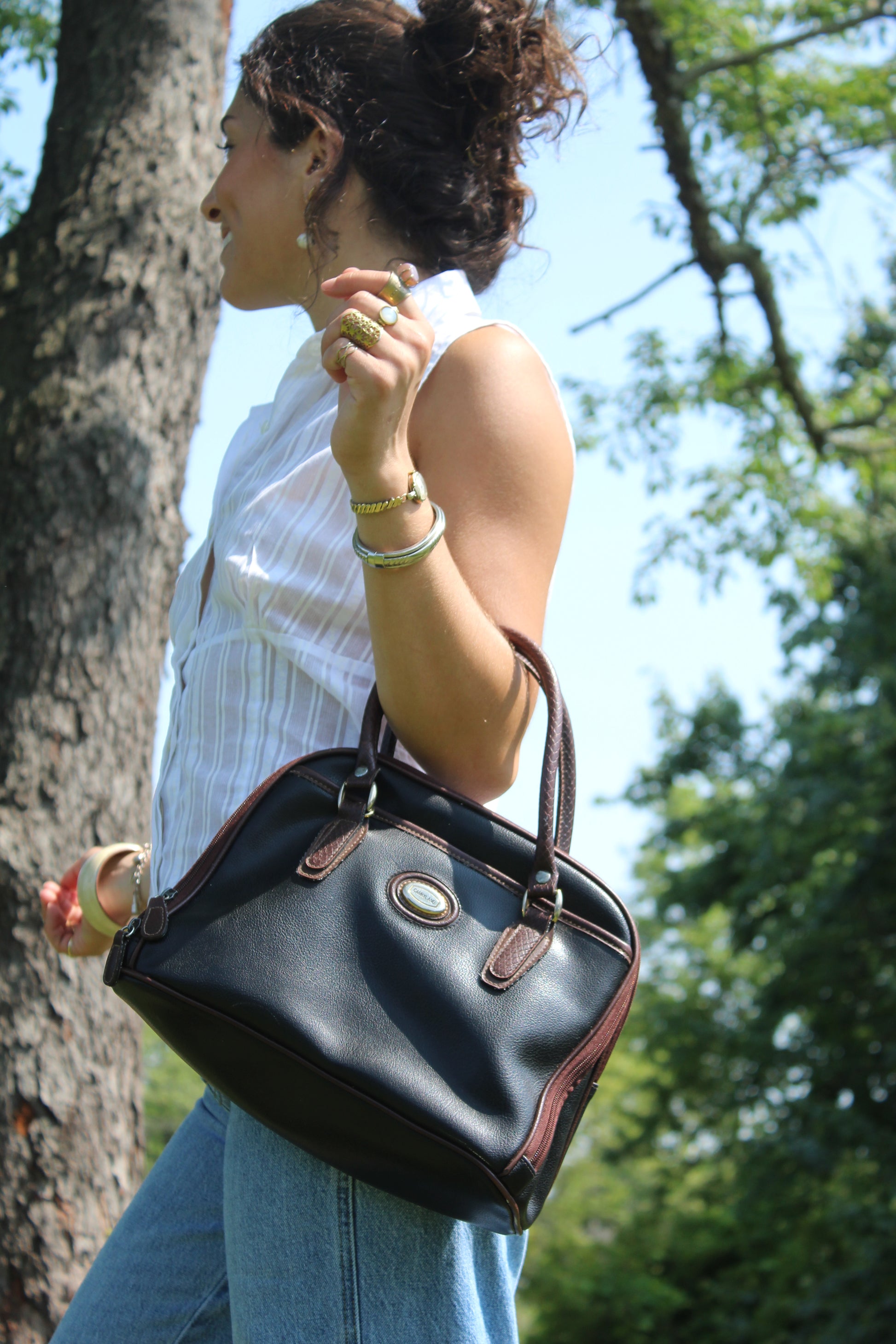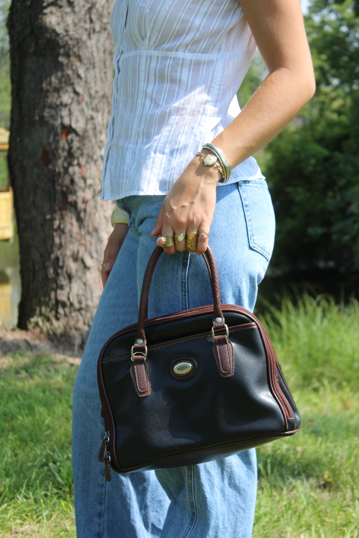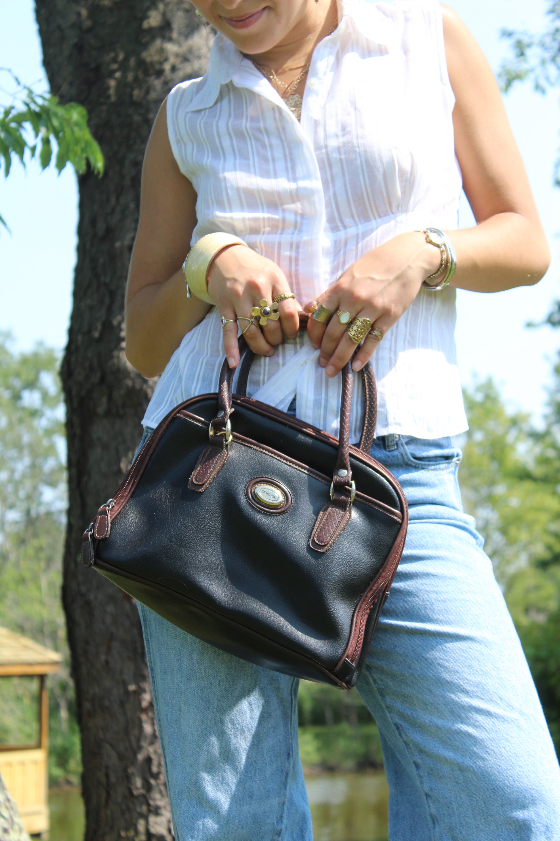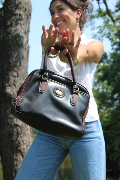 Black purse with brown strap details ad unique shape, so good