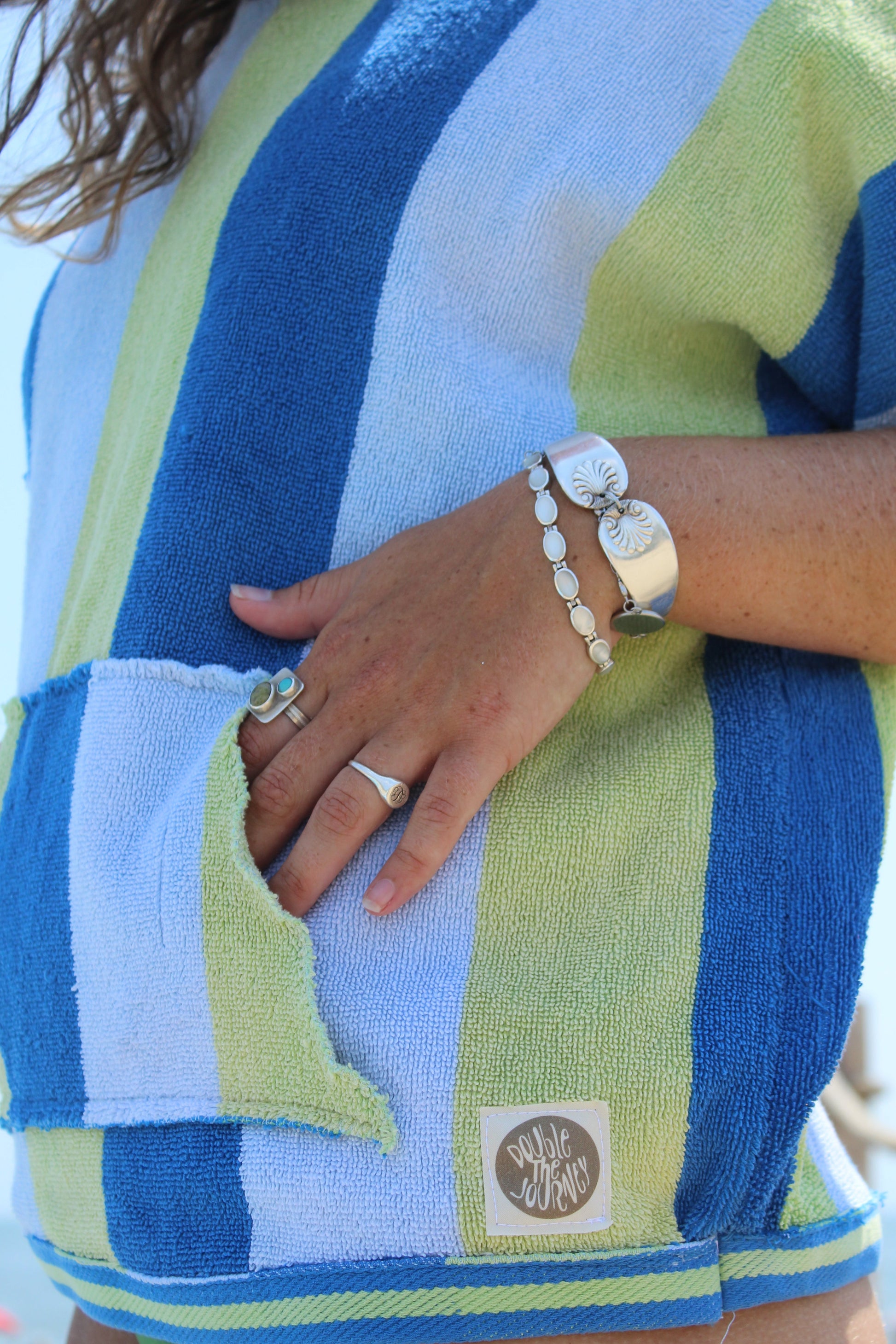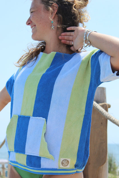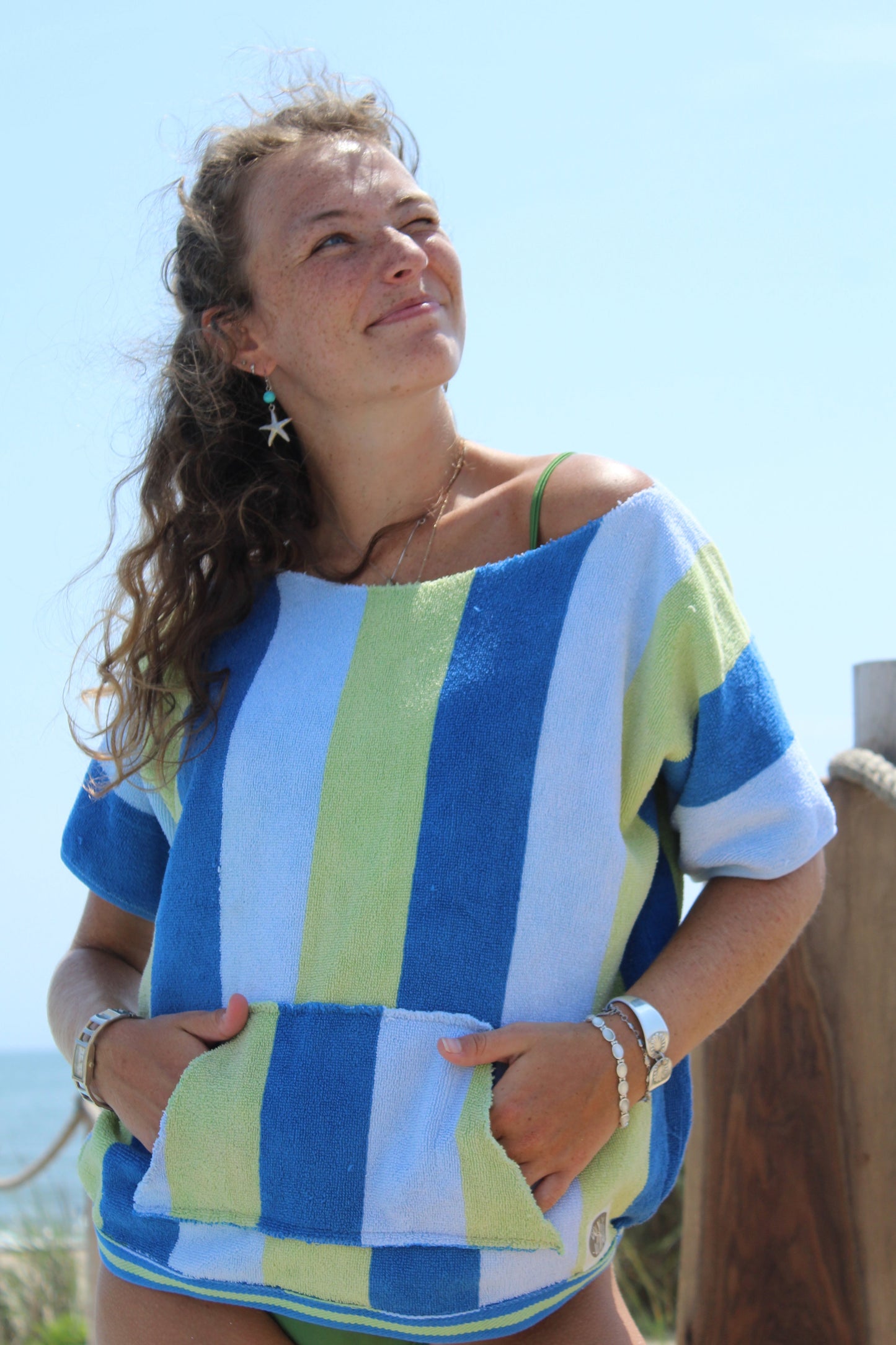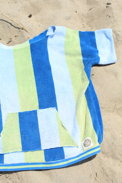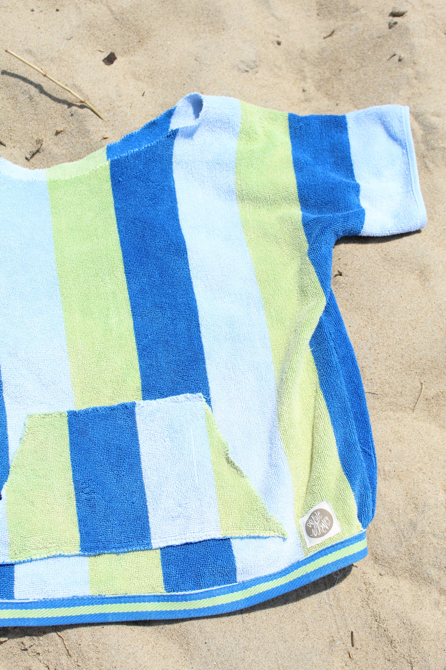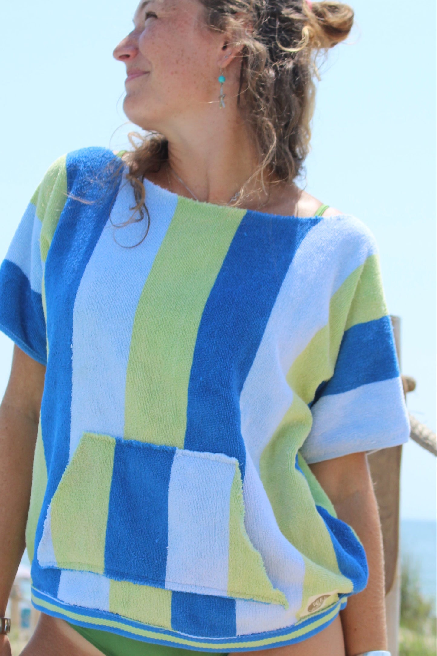 Blue and green towel tee cover up with center pocket, wide neckline, and bottom trim detail