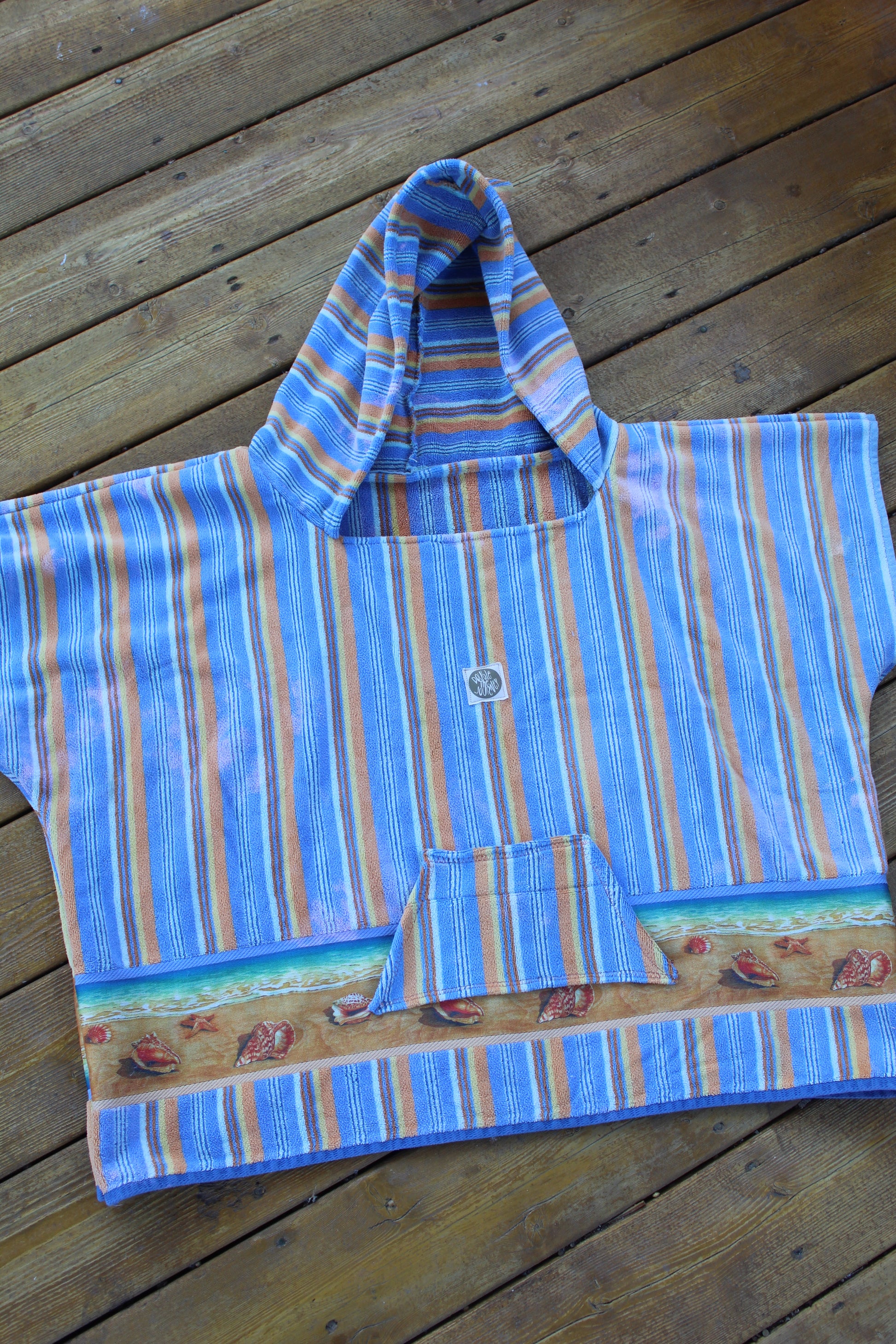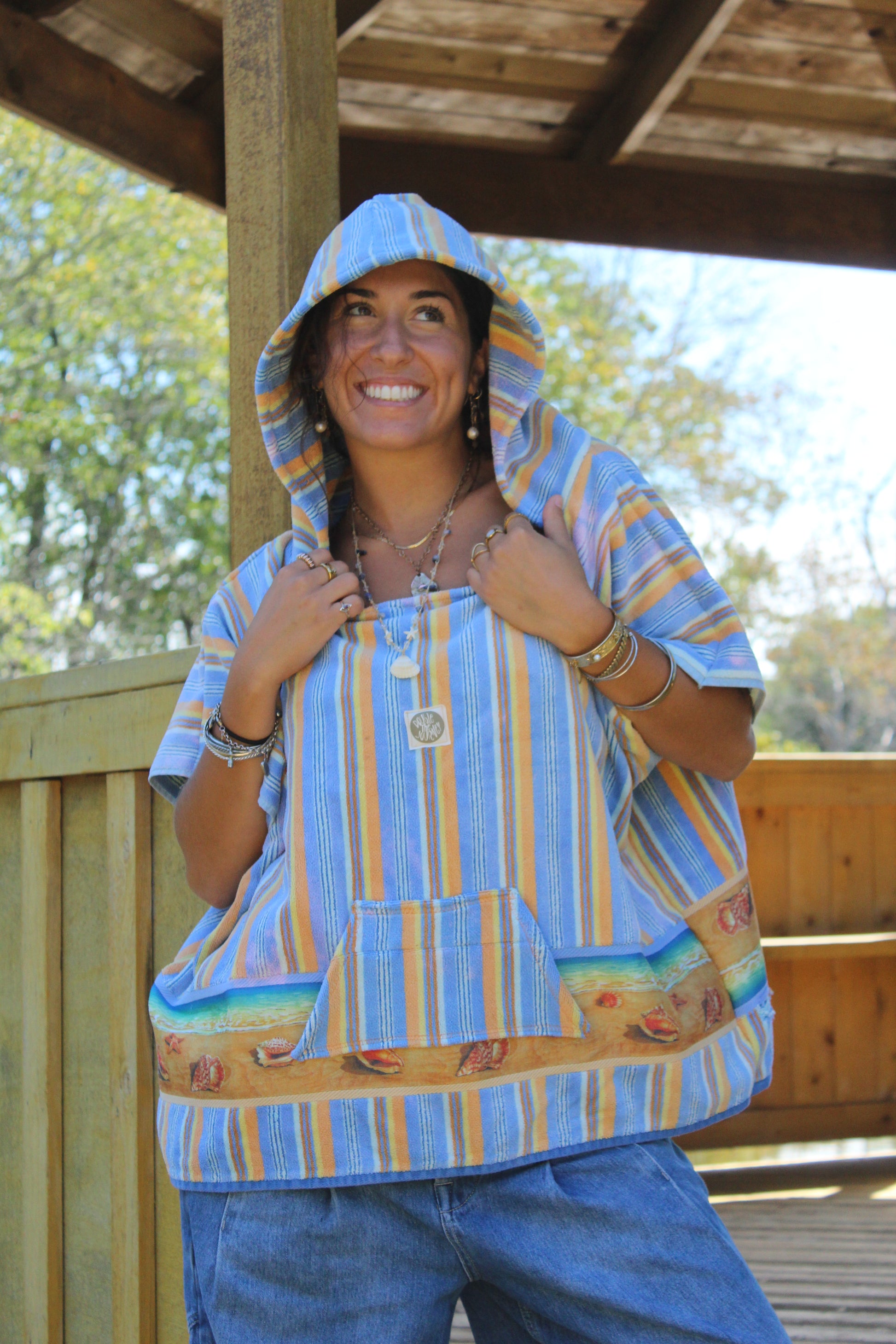 A handmade striped hoodie with a shell feature, revived from a vintage towel!