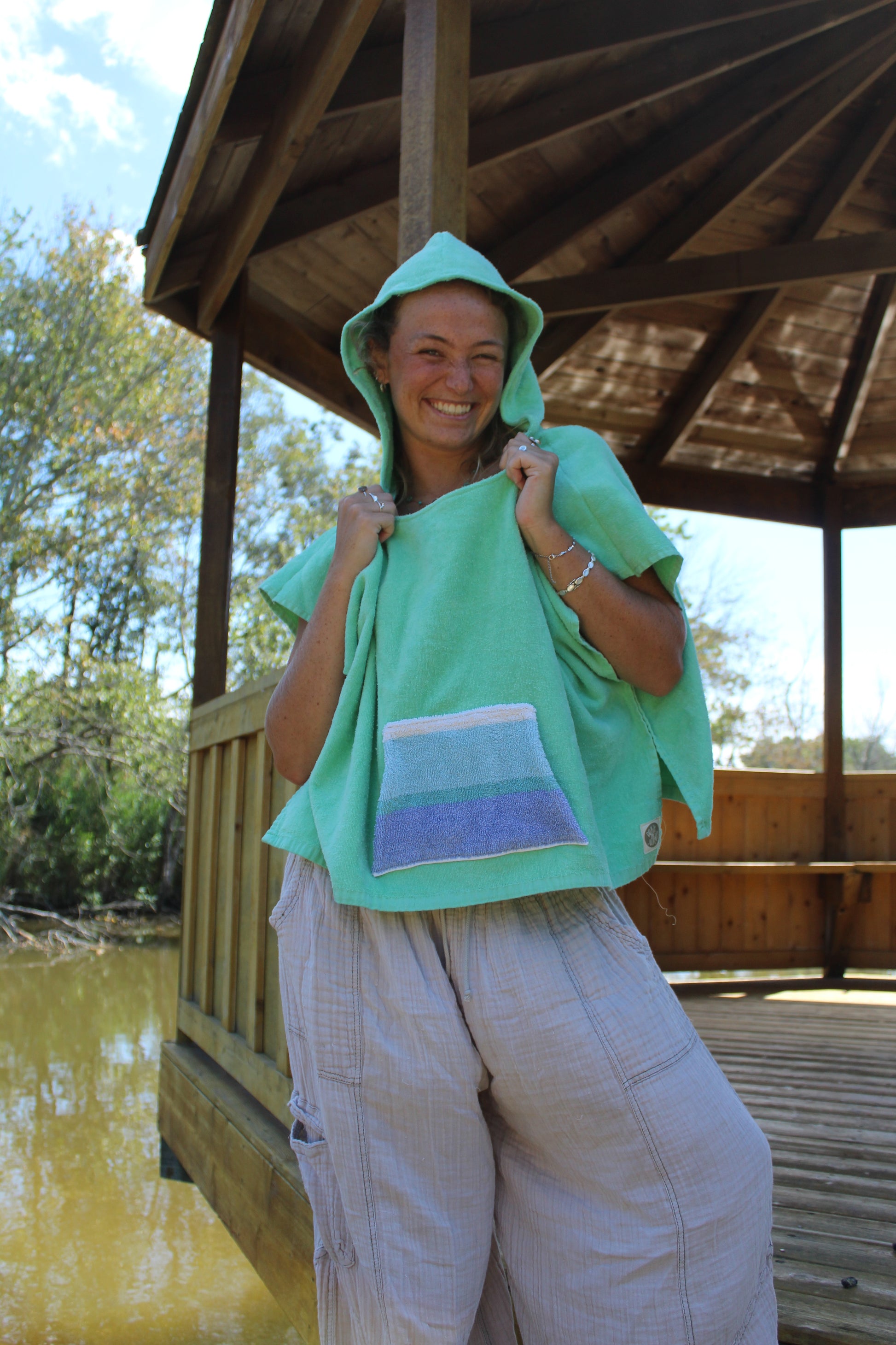 A handmade green hoodie with a palm tree detail on the back, revived from a vintage towel! (Check out the matching bag too<3)
